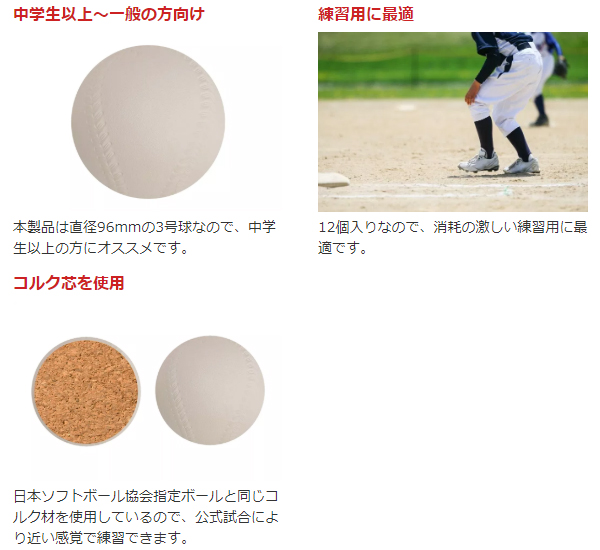 ●日本ソフトボール協会指定ボールと同じコルク材を使用しているので、公式試合により近い感覚で練習できます。