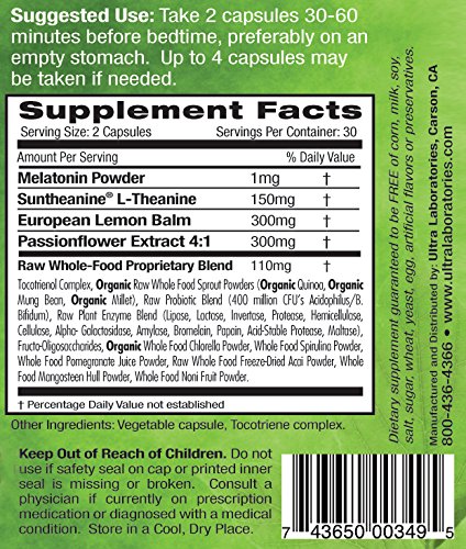 -. Feature : Sleep Health with Suntheanine® and Passionflower / 60 Vegetable Capsules / Raw Whole-Food Based Formula with Probiotics & Enzymes. Vegan. / Dietary supplement guaranteed to be FREE of corn, milk, soy, salt, sugar, wheat, yeast, egg, artificial flavors or preservatives.
