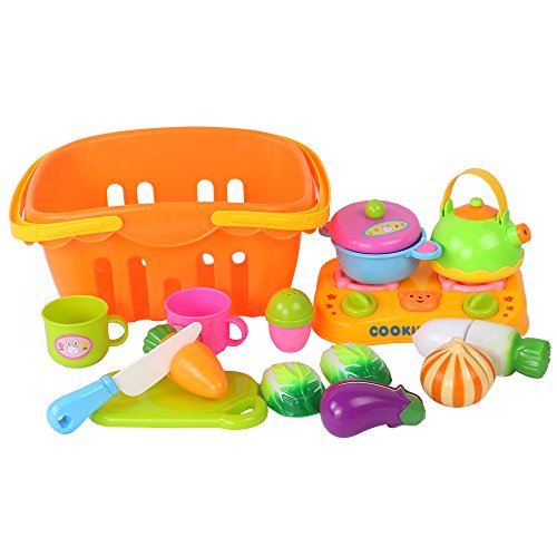 -. Feature : Durable Material:Made of environmentally friendly plastic with smooth surface and curves, 100% non-toxic, durable and safe for kids to play with. / Include Inside:Includes 14 pieces, a combination of cooking top,pots,cups,vegetables, spice shaker,chopping board, play knife and Grocery Basket. / Selling Points:With self-stick velcro holding fruits pieces together, then "slice" apart, perfect for pretend play. Children also love the basket,pretend they shop the vegetables and put them in the basket. / Benifit:Ideal toys for kids' early development,encourage gross and fine motor skill development, improve kids' color cognition ability. / Recommended for kids age 3 years and up.To let them know more about food or something else.