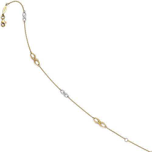 -. Binding : Jewelry -. Brand : The Black Bow -. Color : Yellow -. Department : womens -. Feature : Two tone 14k yellow and white gold / Approximate width 5mm / Adjustable 9 or 10 inch length / Weight is Approximately 1.83 grams / Includes our custom gift box -. Label : The Black Bow -. Manufacturer : The Black Bow -. Model : A8652 -. MPN : A8652 -. NumberOfItems : 1 -. PackageQuantity : 1 -. PartNumber : A8652 -. ProductGroup : Jewelry -. ProductTypeName : FINENECKLACEBRACELETANKLET -. Publisher : The Black Bow -. Studio : The Black Bow -. Title : 14K Two Tone Gold Polished Infinity Station Anklet, 9-10 Inch