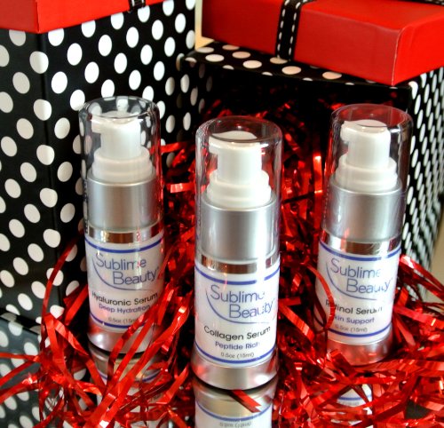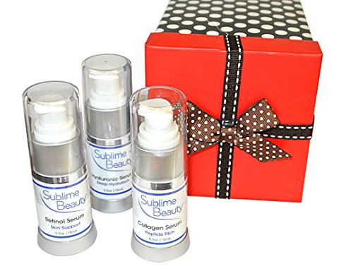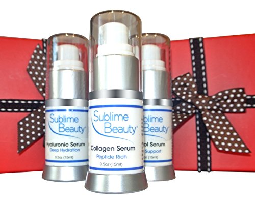 -. Binding : Misc. -. Brand : Sublime Beauty® -. EAN : 0820103522564 -. Feature : BEAUTIFUL GIFT! THREE TOP SKINCARE SERUMS For Powerful Skin Care in a BEAUTIFUL GIFT BOX, READY TO GIVE. No Wrapping Needed. She will Love the Gorgeous Box filled with Perfect Staple Skincare! / COLLAGEN PEPTIDE Serum Boosts Collagen Production with Matrixyl / HYALURONIC SERUM Plumps & Adds Moisture, Helps Collagen Synthesis / RETINOL SERUM with Vitamin C is a the "Gold Standard" in Skincare; Non-irritating Formula / MONEYBACK GUARANTEE if Not Satisfied on All Sublime Products, so Give with Confidence! LIMITED SUPPLIES! -. Label : Sublime Beauty -. Manufacturer : Sublime Beauty -. MPN : SB13 -. PackageQuantity : 3 -. PartNumber : SB13 -. ProductGroup : Beauty -. ProductTypeName : BEAUTY -. Publisher : Sublime Beauty -. Studio : Sublime Beauty -. Title : CHRISTMAS GIFT BOX with 3 SKIN CARE SERUMS: Retinol, Hyaluronic, and Collagen. 0.5 oz each. Distinctive Christmas Gift She Will Love! -. UPC : 820103522564