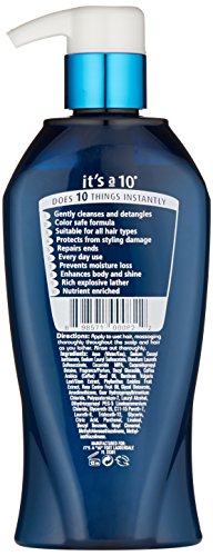 Unlike shampoos that strip away hair’s natural oils and resiliency, It’s a 10 Potion 10 Miracle Repair Shampoo actually strengthens and corrects hair with each use. This rich, color-safe formula builds to a thick, foamy lather that penetrates the entire hair shaft from roots to tip, healing the cuticle and sealing dry, split ends. Essential natural compounds and botanical moisture impart silky softness and manageability while also protecting against environmental stressors and heat styling. Gentle and clean rinsing, hair is left feeling strong, bouncy, and full of body. Over time, hair’s condition improves to its absolute best – vibrant and beautiful in every way.Feature