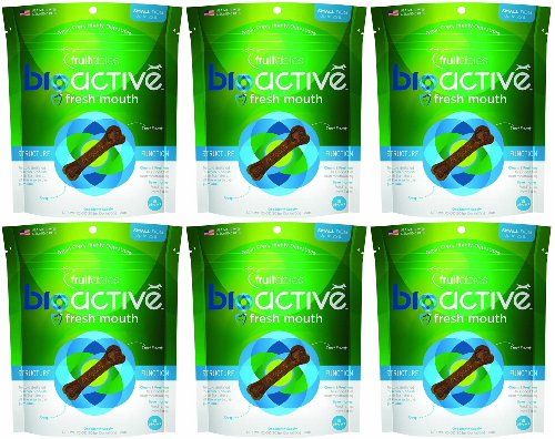 Fruitables BioActive Fresh Mouth Dental Dog Treats, Small 90ct (6 x 15ct) scrub the entire tooth by providing a firm but flexible texture that the teeth sink into. They feature Icelandic sea kelp and decaf green tea extract, which are packed with phytonutrients to help stop the growth of bacteria on the tooth surface.