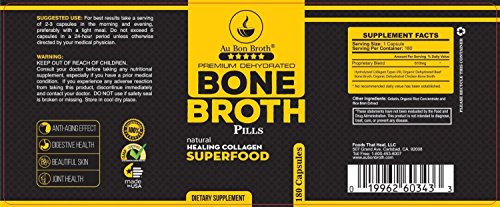 -. Feature : BONE BROTH PROTEIN PILLS - Dehydrated bone broth powder pills are made from Au Bon Broth's 5-Star award-winning and best-selling fresh organic bone broth. Integrate this fresh bone broth supplement into your diet to promote cleansing and detox. / HIGH NATURAL COLLAGEN CONTENT - Collagen is the building blocks of healthy bones, skin, hair, and nails. Bone broth collagen corrects thin, broken, discolored and damaged nail beds and thickens hair. / HEALTH PROPERTIES - Bone broth collagen repairs connective tissues to promote mobility and flexibility; rejuvenates blood vessels to help improve circulation and much more. / BEST INGREDIENTS - Our bone broth protein powder is produced with ingredients that are certified organic, non-GMO, USDA organic pasture raised animals that are ethically and sustainably raised, and contain absolutely NO gluten/soy/dairy/MSG/hormones/antibiotics. Made in USA, GMP Certified. / SATISFACTION GUARANTEED - View all our different quantity options. Take a couple pills a day to get the health benefits of bone broth protein.