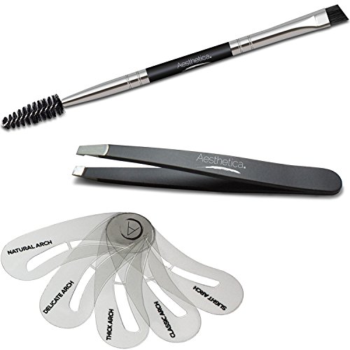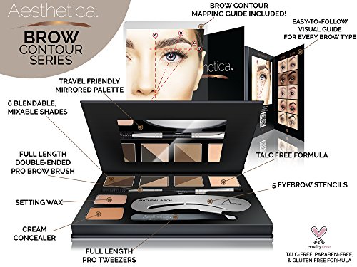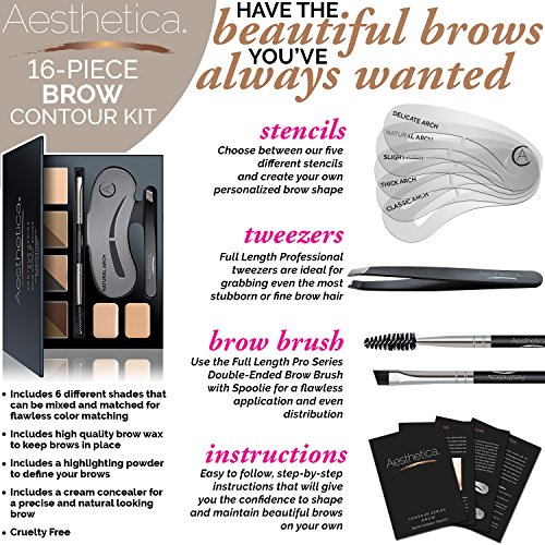 Each kit includes: A Step-by-Step Instructions and Brow Shaping Guide, 6 blendable brow powders (Soft Blonde, Taupe, Soft Brunette, Auburn, Dark Brunette and Ebony), High Definition Highlighting Powder, Cream Concealer and Highlighter, Setting Wax / Pomade, Full Length Professional Tweezers, 5 Eyebrow Stencils in classic and timeless brow shapes and an Aesthetica Pro Series Double Ended Brow Brush with Spoolie