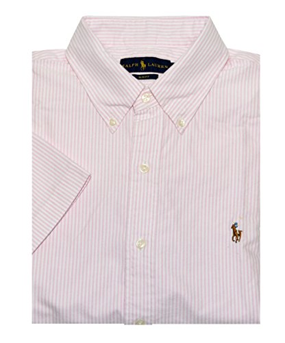 Ralph Lauren Men's Slim Fit Oxford Short Sleeve Striped Shirt (Small, Pink/White)