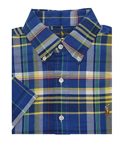 Ralph Lauren Men's Slim Fit Plaid Short Sleeve Oxford Shirt (X-Small, Blue/Yellow)