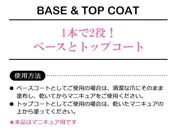 1本でベースコートにもトップコートにも使えます。ネイルをしっかりガードし、長持ちさせます。 |