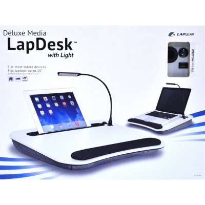 -. Binding : Electronics -. Brand : Lap Desk -. Color : White -. EAN : 0052162913643 -. Feature : Compatible with most laptops up to 15" / Lap cushion for comfortable sessions over an extended period of time / Ergonomic wrist pad provides comfort while typing / Ultra-bright LED light for working in low light conditions / Fits most tablet devices -. Label : Creative Manufacturing, LLC -. Manufacturer : Creative Manufacturing, LLC -. MPN : 734540 -. PackageQuantity : 1 -. PartNumber : 734540 -. ProductGroup : PC Accessory -. ProductTypeName : COMPUTER_ADD_ON -. Publisher : Creative Manufacturing, LLC -. Studio : Creative Manufacturing, LLC -. Title : LapGear Deluxe Media LapDesk with Light (White) -. UPC : 052162913643