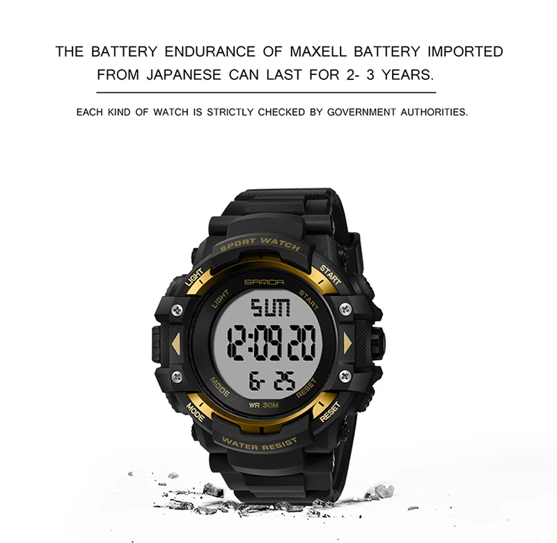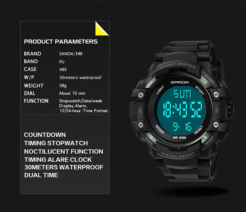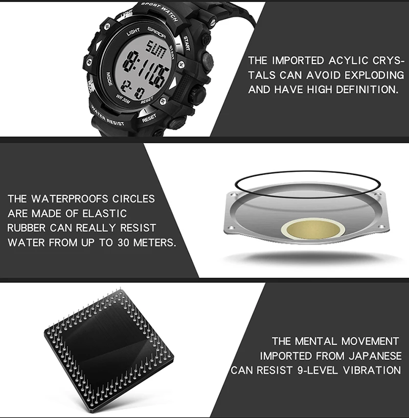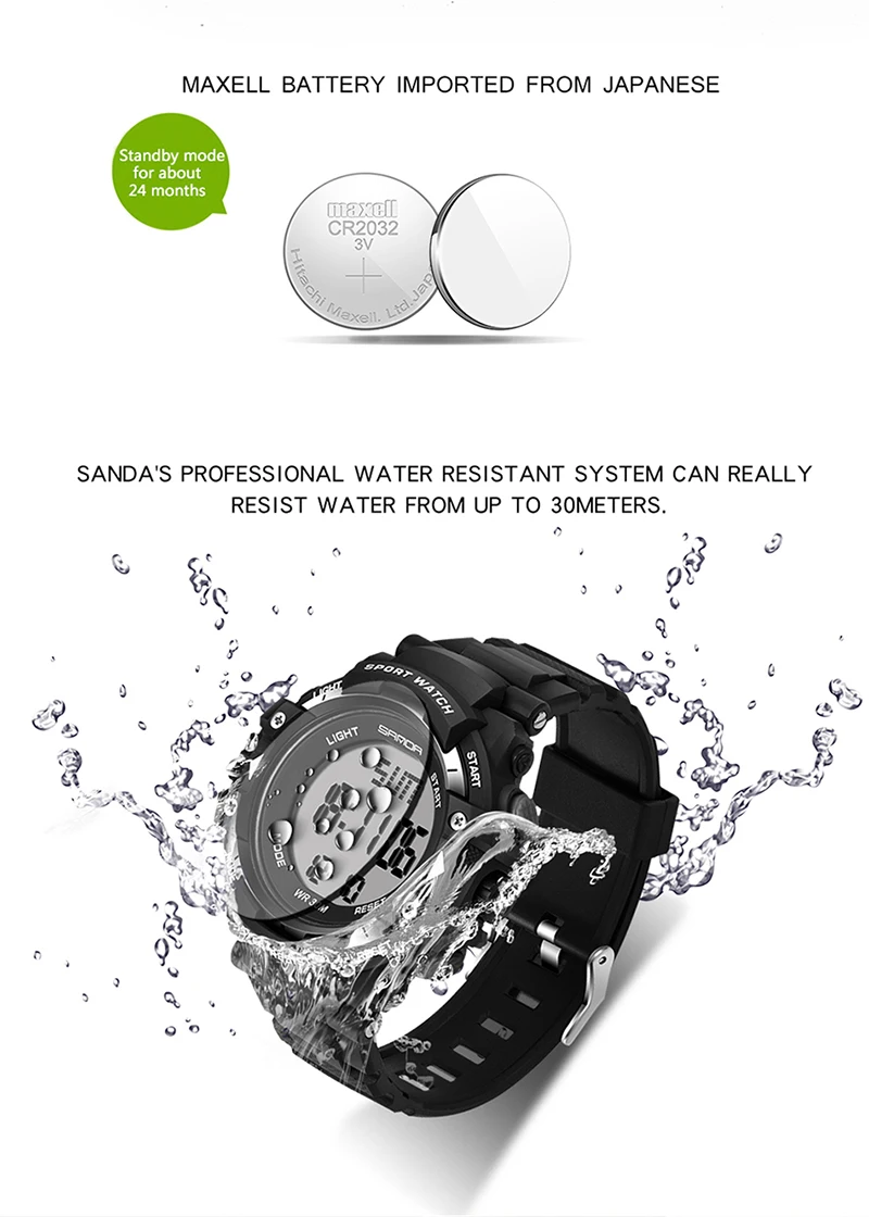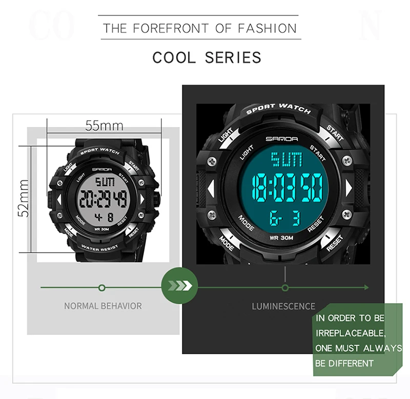 Feature:Back Light,Water Resistant,Multiple Time Zone,Chronograph,Week Display,Shock Resistant,Stop Watch,Complete Calendar,Swim,Auto Date,LED display