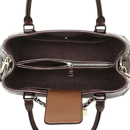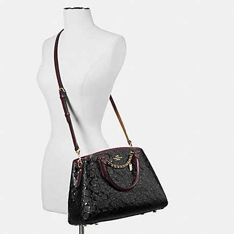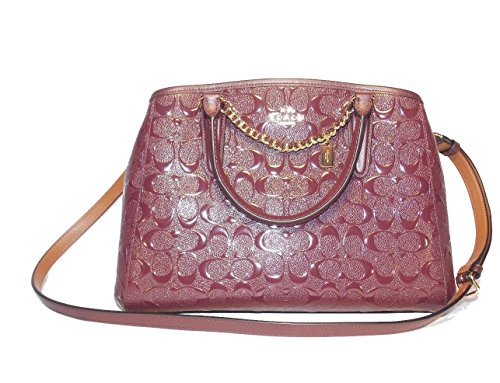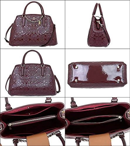 -. Feature : Signature debossed patent leather / Inside zip, cell phone and multifunction pockets / Handle with 3 3/4" drop / Strap with 20" drop for shoulder or crossbody wear / 13 3/4" (L) x 9" (H) x 6" (W)
