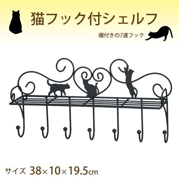 棚付きの7連フックです。 製造国:中国 素材・材質:スチール 商品サイズ:38×10×19.5cm ※サプライヤー直送品 ご注文後2~3営業日後の出荷となります【商品名】猫フック付シェルフ G-4513BK