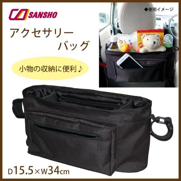 | 車内で子どものおもちゃを収納したり、ポケットに携帯を収納できる便利なバッグです。使用する際は、ヘッドレストポールまたはヘッドレストに、ベビーカーには左右のハンドルに、アクセサリーバッグ左右のベルトで固定します。ベルトがしっかり固定されているか確認してからご使用ください。 |
