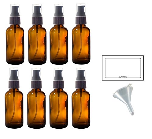 2 oz Amber Glass Boston Round Treatment Pump Bottle (8 pack) + Funnel and Labels for essential oils, aromatherapy, food grade, bpa free