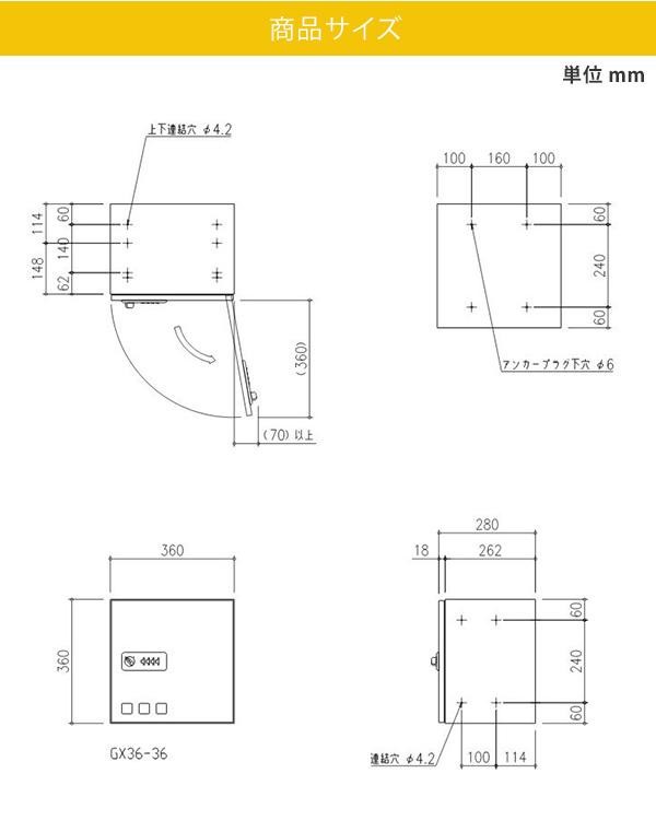 小型荷物用の宅配ボックスです。荷物確認用小窓は、宛名部分が見え難い扉下部に配置し、個人情報保護に配慮しています。操作が簡単な4桁暗証番号ダイヤル錠を使用。GX36シリーズの宅配ボックスや別売の郵便受けと組み合わせて設置できます。 |