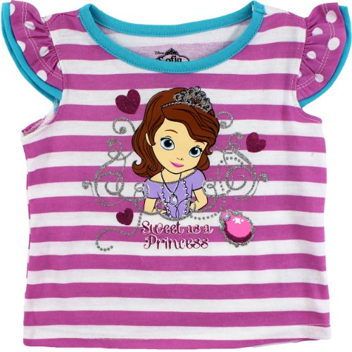 Your little princess in training is sure to be first in line for the throne wearing this darling Disney Sofia the First t-shirt! This Disney Sofia the First top features vibrant colors with glittered accents, ribbed-knit collar and short ruffled cap style sleeves. Any fan of the Disney Junior show, Sofia the First will adore this cute little tee!Feature