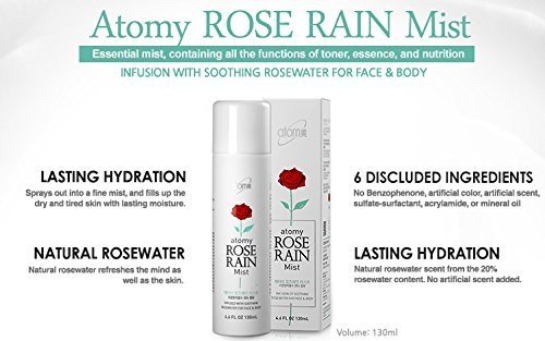 -. Binding : Misc. -. Brand : ATOMY -. EAN : 8809320936691 -. Feature : Korean Import-Atomy Rose Rain Mist / Infused With Soothing Rosewater for face & body / ALL-IN-ONE EFFECT FOR TONER+ESSENCE+NUTRITION IN ONE ESSENTIAL MIST / THE NATURAL SKIN NOURISHING ROSE WATER REFRESHES THE SKIN AND MIND. / SPRAYS INTO A FINE MIST TO PROVIDE A LONG-LASTING MOISTURIZING EFFECT FOR DRY AND TIRED SKIN -. ProductGroup : Beauty -. ProductTypeName : BEAUTY -. Title : Atomy Rose Rain Mist-All-In-One Effect Of Toner+Essence+Nutrition In One Essential Mist- Korean Original (130ml)