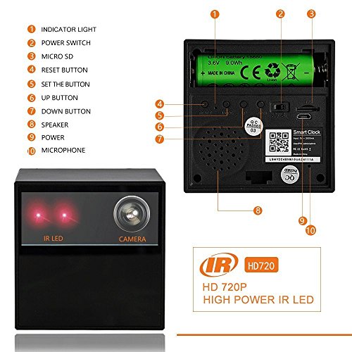 -. Feature : 1. WIFI ACTION VIDEO CAMERA WITH CLOCK, SMALL SIZE -- VICTORSTAR Wifi camera with digital clock has a small size 3x3x3 inch, and it is dressed up as a digital clock, make people will never notice it, it with a stunning HD 1280 x 720P high definition video, and can work over your WiFi, enables you to view a real-time video feed and hear live audio by free APP on your (iOS/Android) WiFi /3G/4G smartphone or tablet anywhere anytime. / 2. ENHANCED NIGHT VISION -- One high-power IR led, infrared night vision distance up to 26 feet ( 8 meters ), the night vision is clean and perfect, it is great for monitoring child (baby), elderly, pet, your gun or security. / 3. RECORDING -- Built-in a Micro SD card slot, just like a DVR integrated into the camera, it can store the video and audio directly to Micro SD Memory card, Support 64GB in Max. You also can save the video on your iOS/Android smartphone or tablet. The saved video in your Micro SD card can be remotely viewed from Android or iOS device. / 4. MOTION DETECTION SUPPORT -- it supports motion detection, and the sensibility can be adjusted yourself. Email alerts / snapshots and push alerts to your smartphone APP. Camera can be set to record to your micro SD card when motion is detected. / 5. YOUTUBE VIDEO -- Please watch video in Youtube, https://youtu.be/-jYNXE2ZLB0