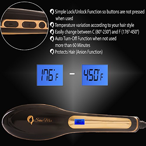 - MAKES THE PERFECT GIFT! To be used as a three in one brush, it can comb, straighten, and detangle hair efficiently; the SARA MOR HAIR STRAIGHTENER BRUSH has a built-in lock function and automatic shut off after one hour; it can be used internationally as one-ten or two-twenty volts (adapter not included) and warms up in less than five minutes;