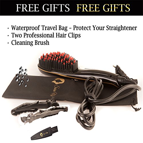 - FREE BONUSES INCLUDED: Not only does the SARA MOR HAIR STRAIGHTENER come with a black waterproof Travel Carry Bag with a drawstring for the brush, but also a Cleaning Brush and two sturdy Hair Clips; this durable, easy to use flattening brush works on long, short, thick, thin, curly, or wavy hair for both sexes;