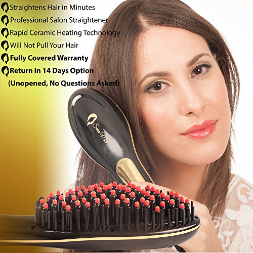 - GET PRESTIGE SALON RESULTS INSTANTLY: With the Professional SARA MOR HAIR STRAIGHTENER BRUSH say goodbye to curly, frizzy, and wavy hair; its ionic ceramic plate heats up in less than ninety seconds, releasing negative ions or anions that make your hair shine, feel smooth, and in style; the gold and black set comes with brush, travel bag, cleaning brush, and hair clips; you will notice the difference right away; brush dimensions are approximately twelve by five by three inches;