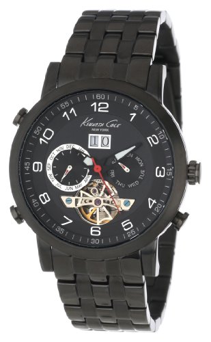 Studio : Kenneth Cole New York ReleaseDate : 2013-03-25 Publisher : Kenneth Cole New York Binding : Watch Product Description Casual watch, Automatic movement, Black hands with luminous accents, Polished silver-tone numbers, Small grey numbers and indices, Analog date display, Mechanism see-through display window, Brushed/polished stainless steel black ion plated bezel, case and crown, Polished stainless steel silver-tone see through caseback, Water resistant 0