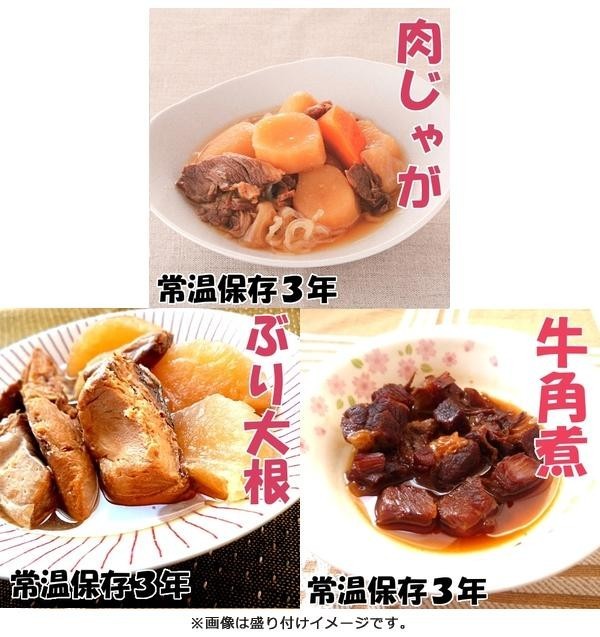 長期保存可能なお惣菜「LL肉じゃが」「LLぶり大根」「LL牛角煮」のセットです。常温で長期保存可能(製造より3年)ですので、冷蔵庫や冷凍庫にいれる必要がなく、他の防災グッズと一緒に保管でき場所をとりません。 |