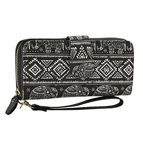 Bohemian Wallet Purse Zip Around Canvas Wallet Elephant Pattern Long Clutch Phone Card Handbag with Wristlet