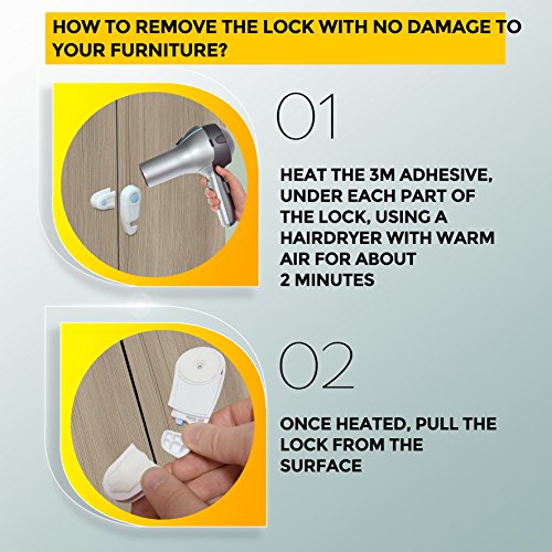 These child locks effectively ensure that your child, baby or toddlers will not be able to open the cabinet or cupboard doors. You can use them for the kitchen, bathroom, pantry or room cabinets and cupboards not only to protect your babies but also to protect the cabinets from dogs and a cat. What Happens when your child outlives the need for child safety latches? Our child lock can be easily removed without damaging the furniture by using a hair dryer to dry the adhesive and remove the child safety lock.