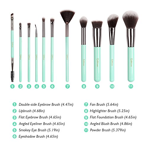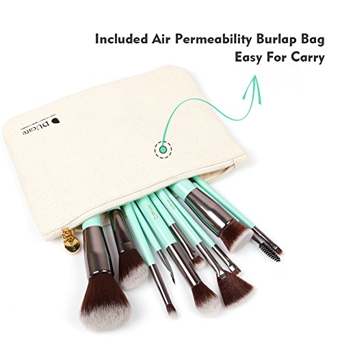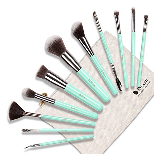 DUcare Wooden Handle Makeup Brush Set with Roll Cases for Girls, Mint Green (11 Pieces)