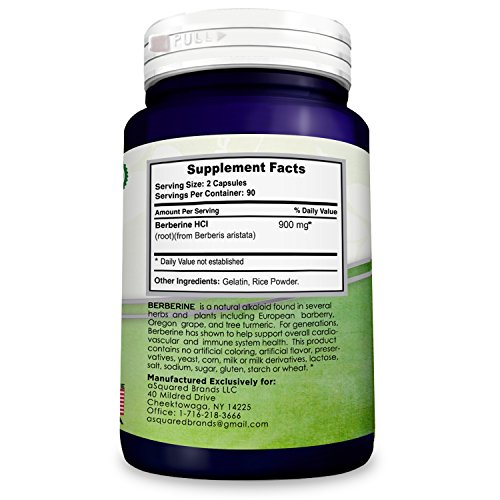 -. Binding : Health and Beauty -. Brand : aSquared Nutrition -. EAN : 0638170999871 -. Feature : ALL NATURAL - DOCTOR FORMULATED - MAX STRENGTH - Our product delivers 900mg pure Berberine HCI per daily intake. Berberine has a rich history in herbal medicine, and can support cardiovascular healthy and overall wellness. / BEST VALUE ON AMAZON - 180 CAPSULES - 3 MONTH SUPPLY - You receive 180 veggie capsules for a FULL 90 day supply (others offer half for a more expensive price), all backed by our best in the industry" 100% MONEY BACK GUARANTEE. / SUPPORT HEALTHY CHOLESTEROL LEVELS - Berberine helps lower LDL cholesterol and triglyceride levels, which is rare in most vitamin supplements. Additionally, Berberine is also used to lower blood pressure and increased weight / fat loss. / HELPS SUPPORT HEALTHY BLOOD SUGAR LEVELS - Berberine is the main active component of the ancient herb Chinese Goldthread, which has been used since the ancient times to maintain healthy blood sugar levels. Try Berberine with aSquared Nutrition's other popular products such as Ceylon Cinnamon, Turmeric Curcumin, Resveratrol, and more! / NATURAL FORMULATION: No fillers, binders, or potentially harmful preservatives or GMOs means no unwanted side effects for you! We go the extra mile to ensure our supplements have passed extensive quality control testing before being bottle and sold. We use only FDA regulated GMP certified manufacturing facilities in the USA. -. IsAdultProduct : 0 -. Label : aSquared Brands -. LegalDisclaimer : These Statements have not been evaluated by the Food and Drug Administration. This Product is not intended to diagnose, treat, cure or prevent any disease. -. Manufacturer : aSquared Brands -. PackageQuantity : 1 -. ProductGroup : Health and Beauty -. ProductTypeName : HEALTH_PERSONAL_CARE -. Publisher : aSquared Brands -. Studio : aSquared Brands -. Title : Pure Berberine 900mg Supplement - 180 Capsules, Natural Berberine Hydrochloride HCL Complex Plus, Max Strength Almost 1000mg 2x 500mg, Vegetarian Extract for Healthy Blood Sugar Levels & Blood Glucose -. UPC : 638170999871