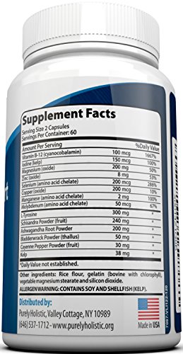 Purely Holistic Thyroid Support Explained? Each ingredient in our thyroid supplement is carefully selected to support normal thyroid activity. The ingredients include: L-TYROSINE: An essential amino acid, it plays a key role in the production of the thyroid hormones Thyroxine and Triiodothyronine. BLADDERWRACK & KELP: Provide natural levels of the essential mineral Iodine which has a vital role in the formation of thyroid hormones. SCHIZANDRA AND ASHWAGANDHA: Used widely by people wanting to lose weight. CAYENNE: The herb is said to increase circulation enabling nutrients to be effectively distributed throughout the body. COPPER, MAGNESIUM, MANGANESE, MOLYBDENUM, SELENIUM AND ZINC: These essential minerals are crucial for the production of thyroid hormones and thyroid function. VITAMIN B-12: The most complex of all vitamins, B 12 has numerous health benefits including normal thyroid function. Why Choose Purely Holistic Thyroid Support? * USA FORMULATED & MANUFACTURED - All our supplements are formulated and produced exclusively in the USA. We use state of the art facilities that adhere to strict manufacturing practices. * BUILT FOR EFFECTIVENESS - Purely Holistic products are scientifically formulated to help improve people's lives. We take great care in selecting our ingredients and suppliers so that you can get maximum benefit. We always offer market leading products while keeping prices low thanks to our buying power. * No. 1 FOR VALUE - We offer 120 capsules significantly more capsules than anybody else. With 14 carefully selected ingredients per capsule we also offer the best Thyroid Support supplement while offering market leading pricing. * NO RISK - Our guarantee is simple - you don't like our products? Use our no quibble guarantee for a 100% refund.Feature