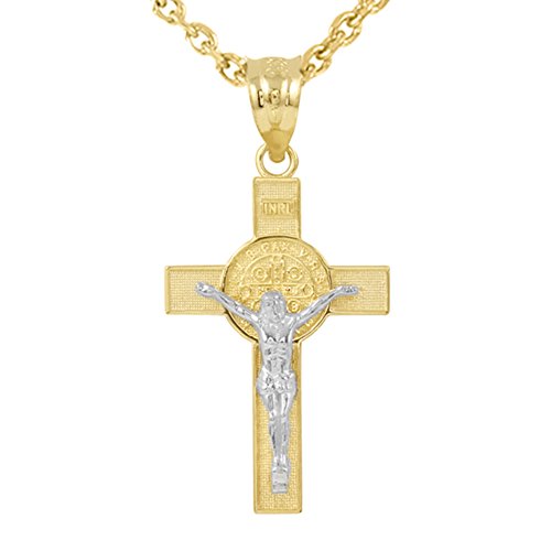 -. Feature : cross-style, Catholic St Benedict crucifix religious protection charm necklace / faithfully handcrafted with solid 14 karat 2-tone white gold and yellow gold in perfect combination finish / comes with free special gift packaging / made in the USA yet offered at factory direct jewelry P.R.Ice / ships from the manufacturer directly to the customers