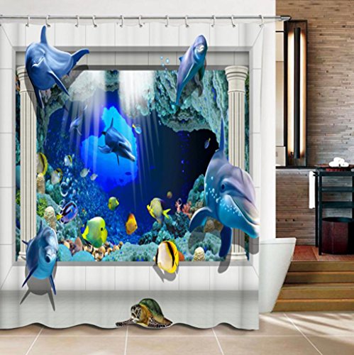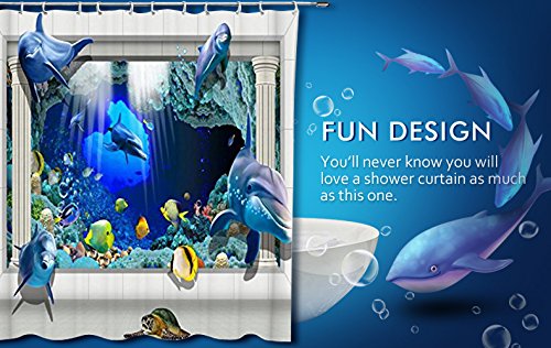 Surblue 3D Dolphin Shower Curtain with Hooks, Made of Polyester, Mildew Resistant & Machine Washable, Width x Heght is 70x70 and 70x80 Inches