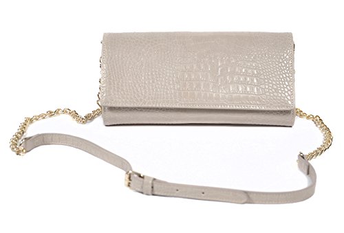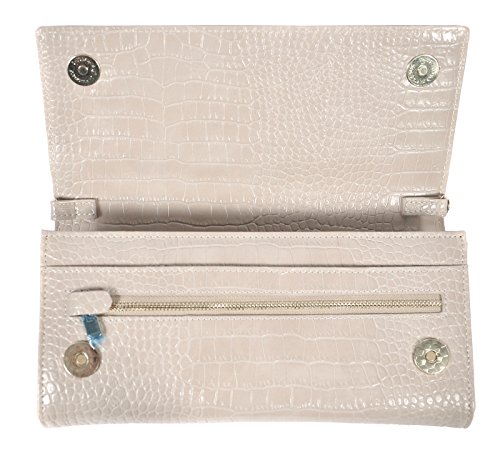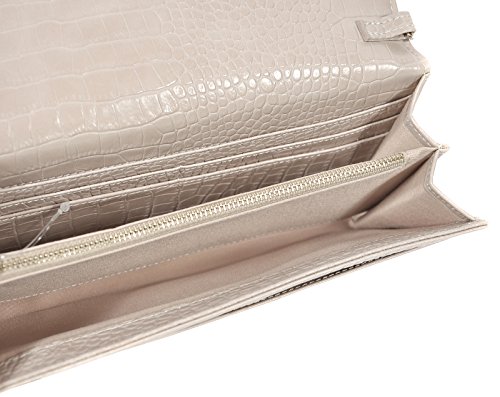 Faux crocodile tri-fold style crossbody clutch. Removable shoulder strap, inner zip and slip pockets with multiple credit card slots