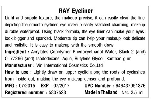 -. Binding : Misc. -. Brand : Ray Inter Cosmetics -. Color : Black -. EAN : 0646437951876 -. Feature : Easy to use / Best Waterproof Liquid Eyeliner / Long Lasting and quick-dry precision liner stays in place until you want to remove it / The eyeliner lines and defines with smooth / To enhance the shape and color of your eyes will looks larger and nicer -. PackageQuantity : 1 -. ProductGroup : Beauty -. ProductTypeName : BEAUTY -. Title : Ray Black Waterproof Liquid Eyeliner Stay All Day Beauty Cosmetic 2.5 Ml Enhance Your Makeup Experience Now -. UPC : 646437951876
