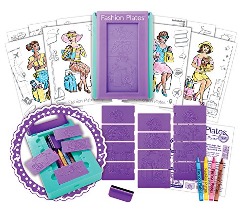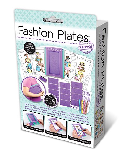 For fashionistas on the go! The Travel Fashion Plates Kit is a take-along size designed for airports, cars and train rides. Compact but with all of the same design fun, just place the plates and pass the rubbing tool over to transfer the design. Includes 8 Fashion Plates, 10 sheets of paper, 4 coloring crayons, 2 rubbing crayons, 1 crayon holder, 1 drawing tablet with storage tray, and 1 idea guide. For ages six and up.