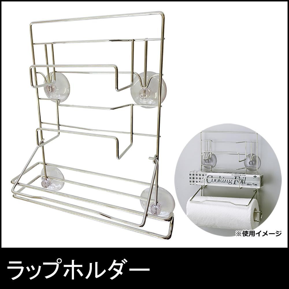 | 吸盤で壁面に簡単取り付け!!ラップを使いたい時にサッと取り出せてとっても便利です。下段にはキッチンペーパーの取付もできるので、必要なアイテムをひとまとめにできます。 |