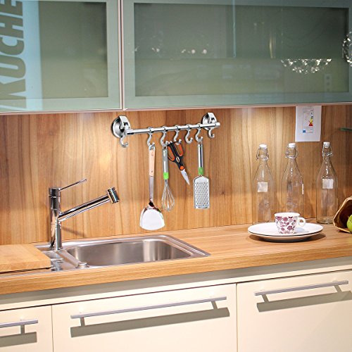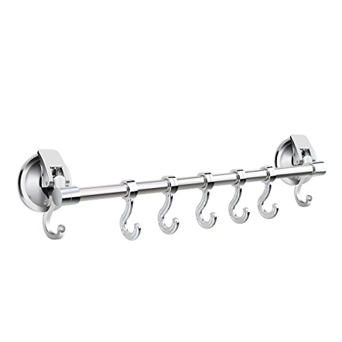 Powerful removable suction cup towel shower hook rack bar rail hanger with 5 sliding utinity hooks organizer for Kitchen spoon,spatula,ladle and barthroom loofah,bathrobe, by iRomic