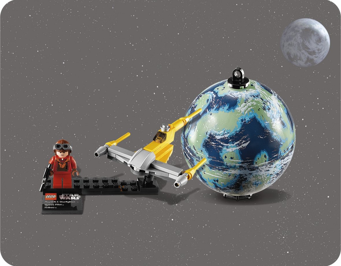 The set includes planetary Naboo type capsule, mini fig of Naboo · pilot, Naboo · Star fighter "! Mini model, weapons, display stand with name board.
