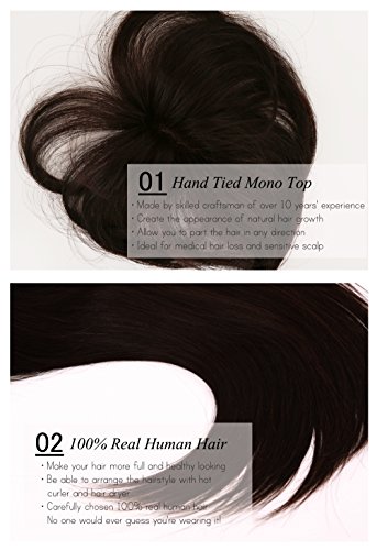 [Hair Topper Helps Get Ur Confidence Back] Hair topper is a perfect solution to add volume,cover thinning hair or conceal new growth between colors. [Hand Tied Mono Top] · Made by skilled craftsman of over 10 years' experience · Create the appearance of natural hair growth · Allow you to part the hair in any direction · Ideal for medical hair loss and sensitive scalp [Carefully Chosen 100% Real Human Hair] · Much more lightweight and easier breathability · Make your hair more full and healthy looking,and no one would ever guess you're wearing it! · Be able to arrange the hairstyle with hot curler and hair dryer as you please [Two Pressure Sensitive Clips] Easy to apply,secure,non-damaging and non-permanent 0 |