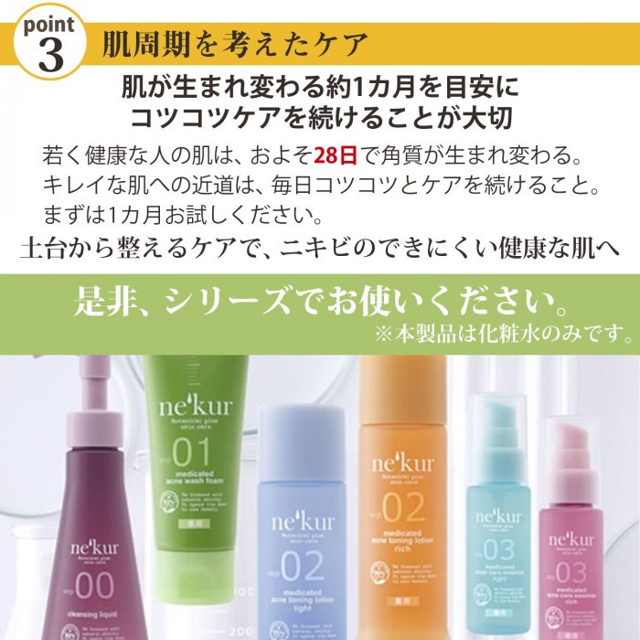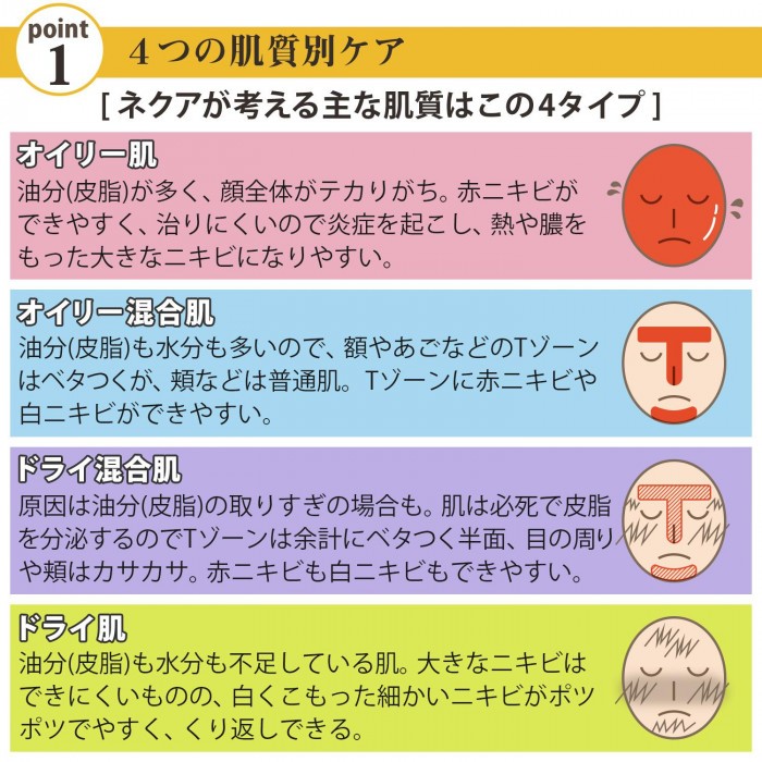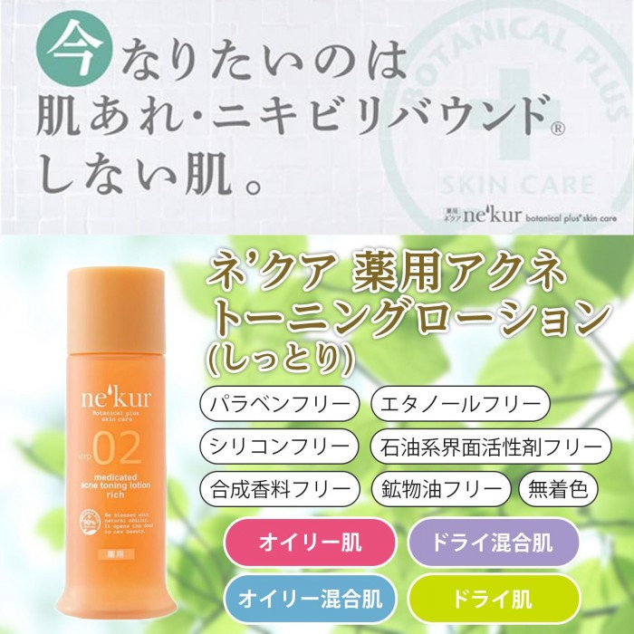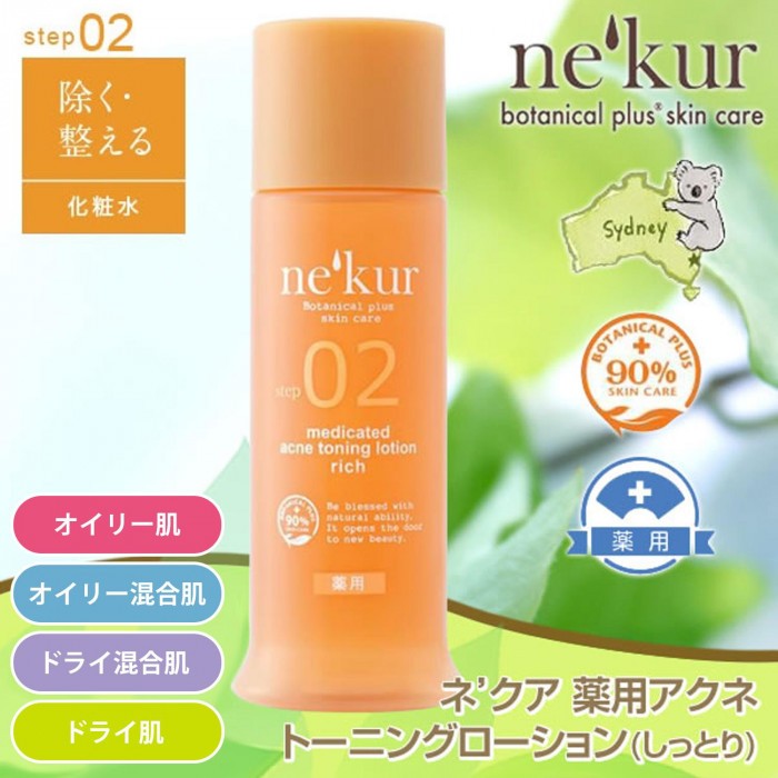 | オーガニックスキンケアの先進国、オーストラリアのスキンケア発想から生まれたニキビで悩む方のためのスキンケア。このネクア シリーズは、思春期ニキビや大人ニキビなどの年齢別ではなく、油分と水分の違いによって4つの肌質別に分け、その肌質にもっとも適したニキビケアを提案し ます。この商品は、オイリー混合肌やドライ肌で悩む方へのしっとりの化粧水です。 |