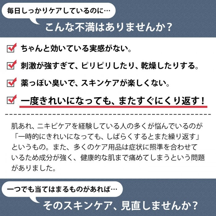 | <h1>発売2年でリピーター続出!!数々の女性誌で紹介された肌質別ニキビケアシリーズ!!</h1> |