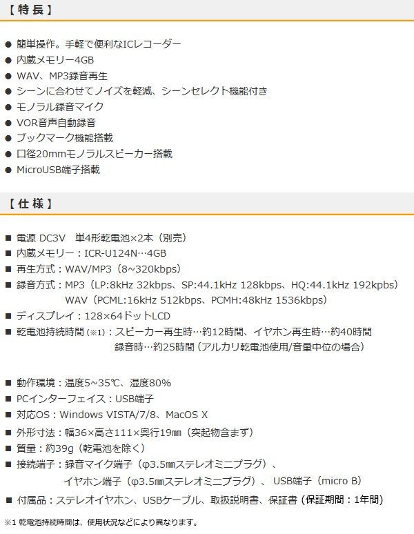 fk094igrjs使用状況に合わせてノイズ軽減を図るプリセットモード搭載列車に乗車中や、会議中などのシーンにおいて適切な録音モードをお選びいただくことができます サイズ 個装サイズ:9×19×3cm 重量 個装重量:150g 製造国 中国 簡単に操作できるICレコーダー 使用状況に合わせてノイズ軽減を図るプリセットモード搭載列車に乗車中や、会議中などのシーンにおいて適切な録音モードをお選びいただくことができます