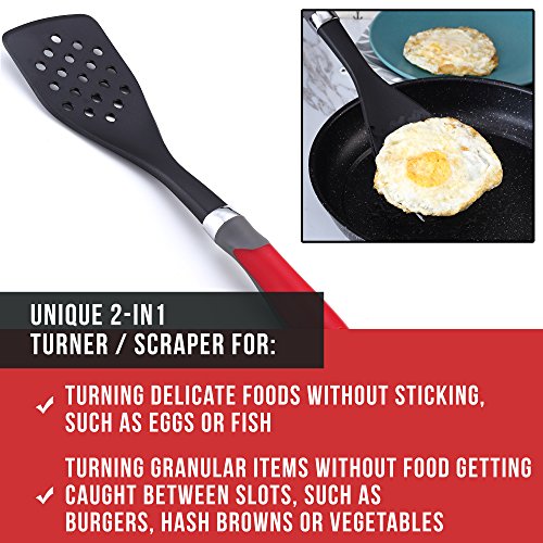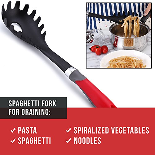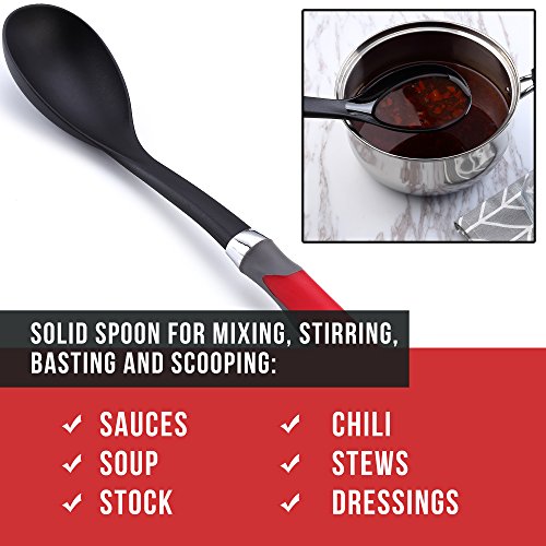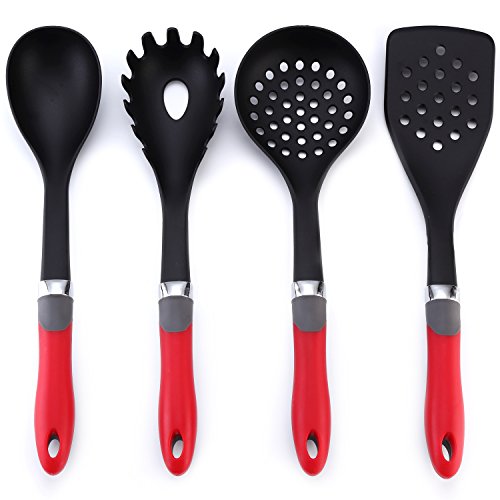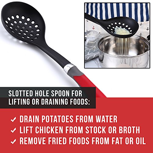 DISHWASHER SAFE AND SPACE-SAVING: Light weight, everyday gadgets that are easy to clean. Just throw into the top rack of a dishwasher, or wash with soapy water. Quality black nylon will not degrade, even when using with hot oil. Hanging hole on each spoon to hang on wall hooks for stress-free storage and a tidy household. Beautiful, large red handles with metal accents for contemporary, classic style and a premium feel, pretty enough to use when serving at dining table.