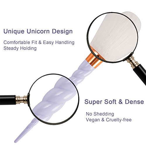 - ✓CREATE YOUR ENTIRE FLAWLESS LOOK-The brushes are soft, dense and silky to the touch with unique design handles for comfortable fit and easy handling. Unique design brush pole shape like a Unicorn Horn. Ideal for stippling, buffing, blending, contouring, highlighting, shading. Imperfections will disappear leaving an airbrushed finish.