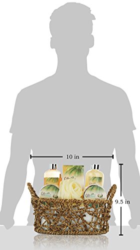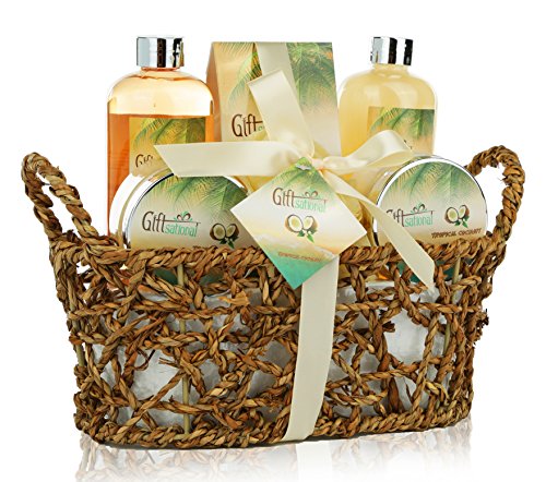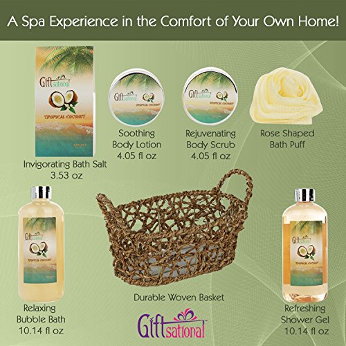 Spa Gift Basket with Rejuvenating Tropical Coconut Fragrance in Cute Woven Basket - Includes Shower Gel, Bubble Bath, Body Lotion and More! - Perfect Wedding Mothers Day or Birthday Gift Set for Women