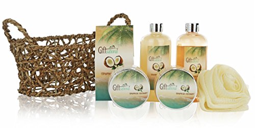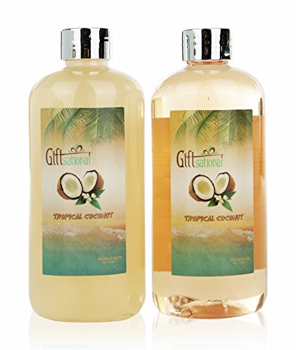 - EXOTIC GETAWAY: Featuring the captivating fragrance of tropical coconut, this bath set takes you to a quick escape to soothing images of an island adventure. The aroma is reminiscent of a tranquil paradise with nothing but blue skies, pristine waters, and white sandy beaches all day long.