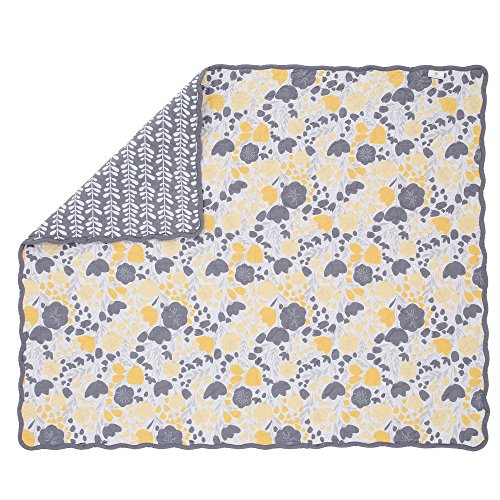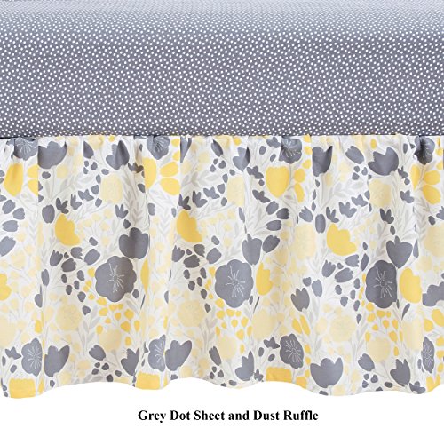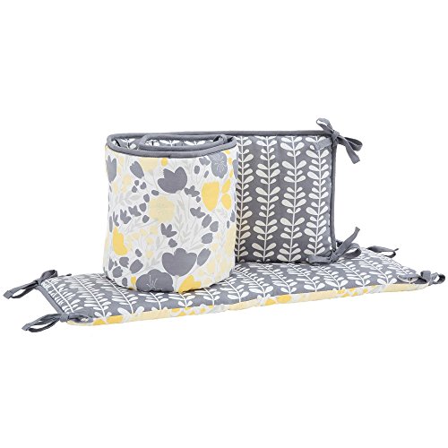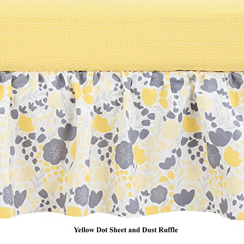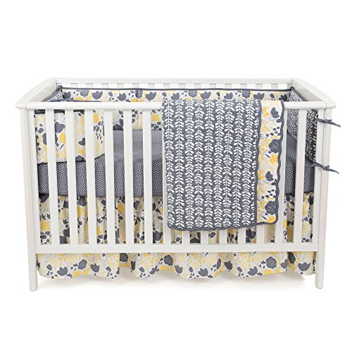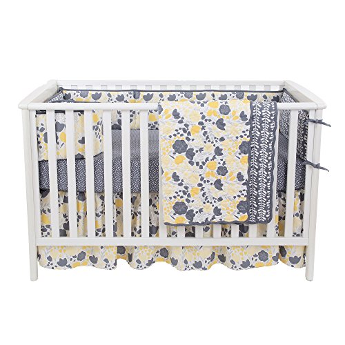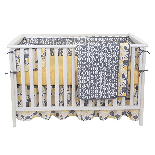 -. Feature : These 100% cotton sets include reversible bumper, reversibhle quilted coverlet, dust ruffle, and either one or two sheets / Quilted coverlet, generously sized at 44 inches by 38 inches, will be your daughter's (or your) favorite for years to come; 100% cotton, even the coverlet filling is cotton; beautiful scalloped edge gives it even more character; detailed quilting adds to the durability of this piece and will have you finding unending uses for it in and out of the nursery / Gathered and ruffled crib skirt has a generous 16 inch drop to assure that your crib looks dressed even with the mattress at the highest setting; yellow and gray floral fabric is 100% cotton; under-the-mattress platform is sturdy polyester that will resist fraying through frequent sheet changes / 100% cotton sateen fitted crib sheets are designed to fit a standard sized crib mattress of 52 inches by 28 inches; all around elastic assures a safe and secure fit every time / Reversible 4 piece bumper provides a variety of distinct decorating choices for inside and outside the crib; configure them with one pattern facing in for all pieces, or mix them up for a unique look; has top and bottom ties for a perfect installation