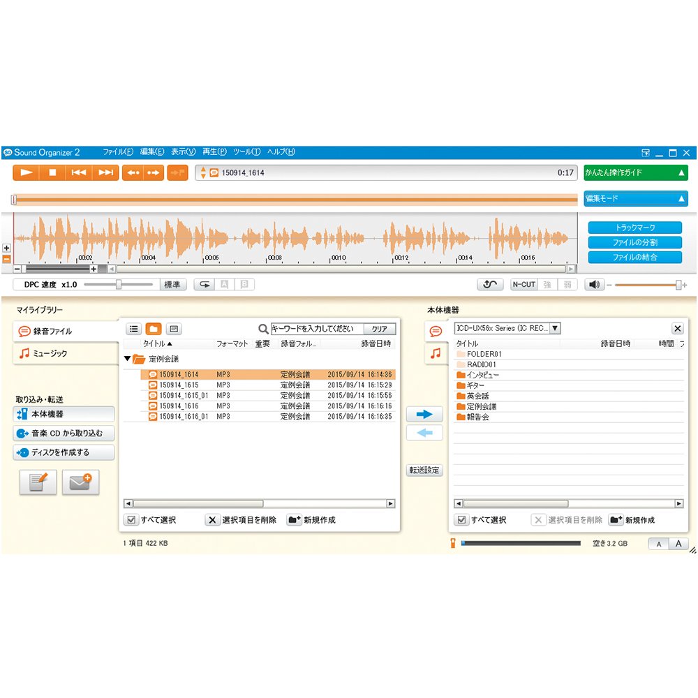 Even when the IC recorder is placed in a position out of reach, you can check the operation and display contents with your own hands.